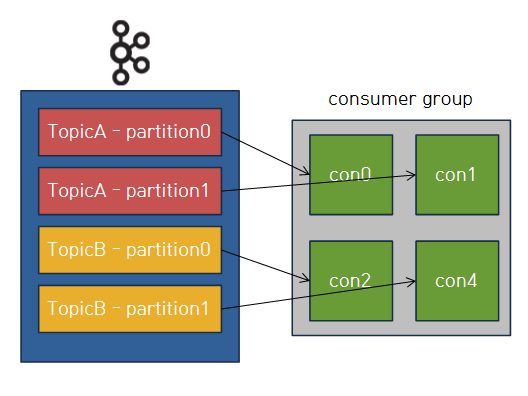 예를 들어 4개의 partition이 있는 topic을 consume하는 4개의 consumer가 하나의 group에 있다면,